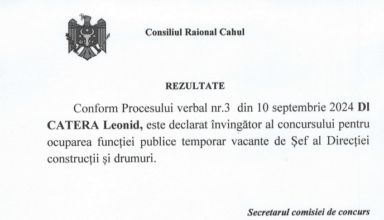 Noutăți REZULTATELE concursului pentru ocuparea funcției publice temporar vacante de Șef al Direcției construcții și drumuri