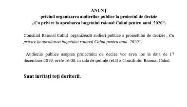 Noutăți ANUNŢ privind organizarea audierilor publice la proiectul de decizie „Cu privire la aprobarea bugetului raional Cahul pentru anul 2020”.