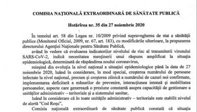 Noutăți Hotărârea nr. 35 a Comisiei Naționale Extraordinare de Sănătate Publică din 27 noiembrie 2020
