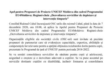 Anunțuri Apel pentru Propuneri de Proiecte UNICEF Moldova din cadrul Programului EU4Moldova: Regiuni-cheie „Dezvoltarea serviciilor de depistare și intervenție timpurie”