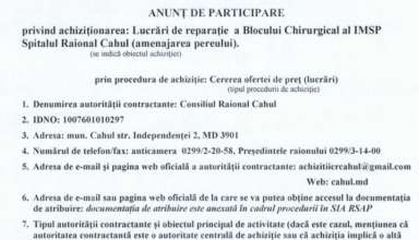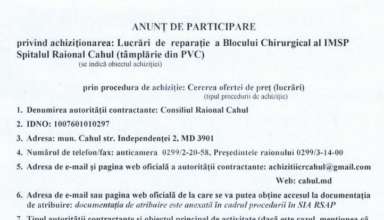 Achiziții publice Anunț de participare privind achiziționarea lucrărilor de reparație a Blocului Chirurgical al IMSP Spitalul Raional Cahul prin procedura de achiziție: Cererea ofertelor de prețuri