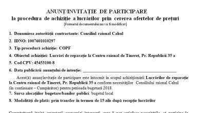 Achiziții publice Anunț! Invitație de participare la procedura de achiziție a lucrărilor prin cererea ofertelor de prețuri