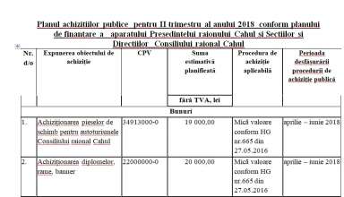 Achiziții publice Planul achiziţiilor publice pentru II trimestru al anului 2018 conform planului de finanţare a aparatului Preşedintelui raionului Cahul şi Secţiilor şi Direcţiilor Consiliului raional Cahul