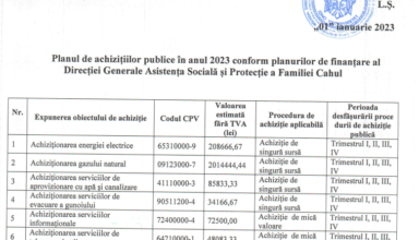Achiziții publice Planul achizițiilor publice în anul 2023, conform planurilor de finanțare al Direcției Generale Asistența Socială și Protecție a Familiei Cahul
