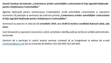 Anunțuri Anunț! Seminar de instruire „Contestarea actelor autorităților contractante în fața Agenției Naționale pentru Soluționarea Contestațiilor”