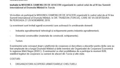 Anunțuri Invitație la MISIUNEA OAMENILOR DE AFACERI organizată în cadrul celui de-al IV-lea Summit internațional al Drumului Mătăsii în Turcia