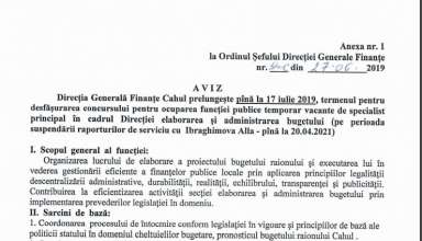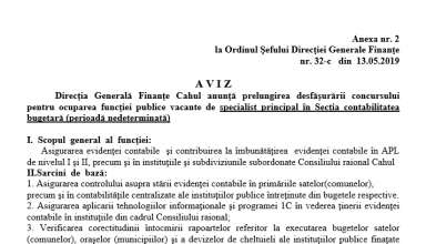 Anunțuri ANUNȚ cu privire la prelungirea termenului de desfășurare a concursului pentru ocuparea funcției publice temporar vacante de specialist principal în cadrul Direcției elaborarea și administrarea bugetului
