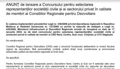 Anunțuri ANUNȚ de lansare a Concursului pentru selectarea reprezentanților societății civile și ai sectorului privat în calitate de membri ai Consiliilor Regionale pentru Dezvoltare