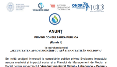Anunțuri ANUNȚ PRIVIND CONSULTAREA PUBLICĂ (Runda II) în cadrul proiectului „SECURITATEA APROVIZIONĂRII CU APĂ ȘI SANITAȚIE ÎN MOLDOVA”