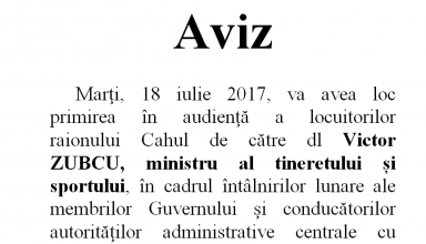 Noutăți Activităţile principale ale Consiliului Raional şi Aparatului Preşedintelui RaionuluiCahul pentru perioada 17.07.2017-21.07.2017