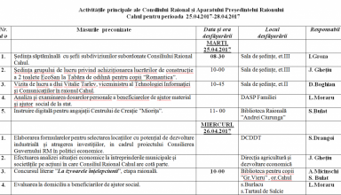 Noutăți Activităţile principale ale Consiliului Raional şi Aparatului Preşedintelui Raionului Cahul pentru perioada 25.04.2017-28.04.2017