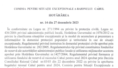 Noutăți HOTĂRÂREA Comisiei pentru Situații Excepționale a Raionului Cahul nr. 14 din 27 decembrie 2023