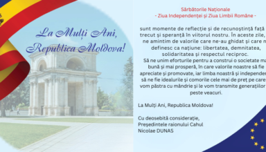 Noutăți Mesaj de felicitare al Președintelui raionului Cahul cu prilejul sărbătorilor naționale „Ziua Independenței Republicii Moldova” și „Ziua Limbii Române”