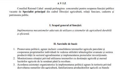 Anunțuri Consiliul Raional Cahul anunţă prelungirea concursului pentru ocuparea funcției publice vacante de Specialist principal din cadrul Direcției agricultură, relații funciare, cadastru și patrimoniu public