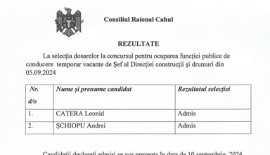 Noutăți Rezultatele selecției dosarelor la concursul pentru осuраrеа funcției publice de conducere temporar vacante de Șef al Direcției construcții și drumuri