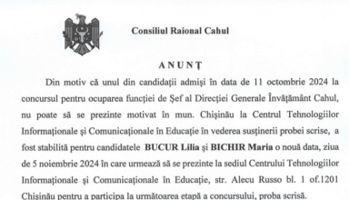Anunțuri ANUNȚ privind modificarea zilei pentru susținerea probei scrise la concursul pentru осuраrеа funcției de Șef аl Direcției Generale Învățământ Cahul,