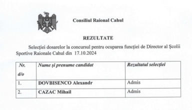 Noutăți REZULTATELE concursului pentru ocuparea funcției de director al Școlii Sportive Raionale Cahul