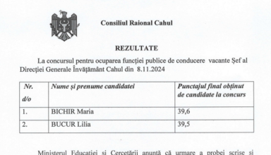 Noutăți REZULTATELE concursului pentru ocuparea funcției publice de conducere vacante de Șef al Direcției Generale Învățământ Cahul