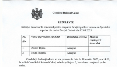 Anunțuri Rezultatele concursului pentru ocuparea funcției publice vacante de Specialist superior al Secției Cultură.