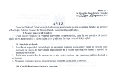 Anunțuri ANUNȚ: privind desfășurarea concursului pentru ocuparea funcției de director al Instituției publice ,,Centrul de Tineret Cahul”