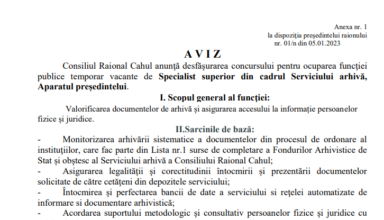 Anunțuri Consiliul Raional Cahul anunţă desfăşurarea concursului pentru ocuparea funcţiei publice temporar vacante de Specialist superior din cadrul Serviciului arhivă, Aparatul președintelui.